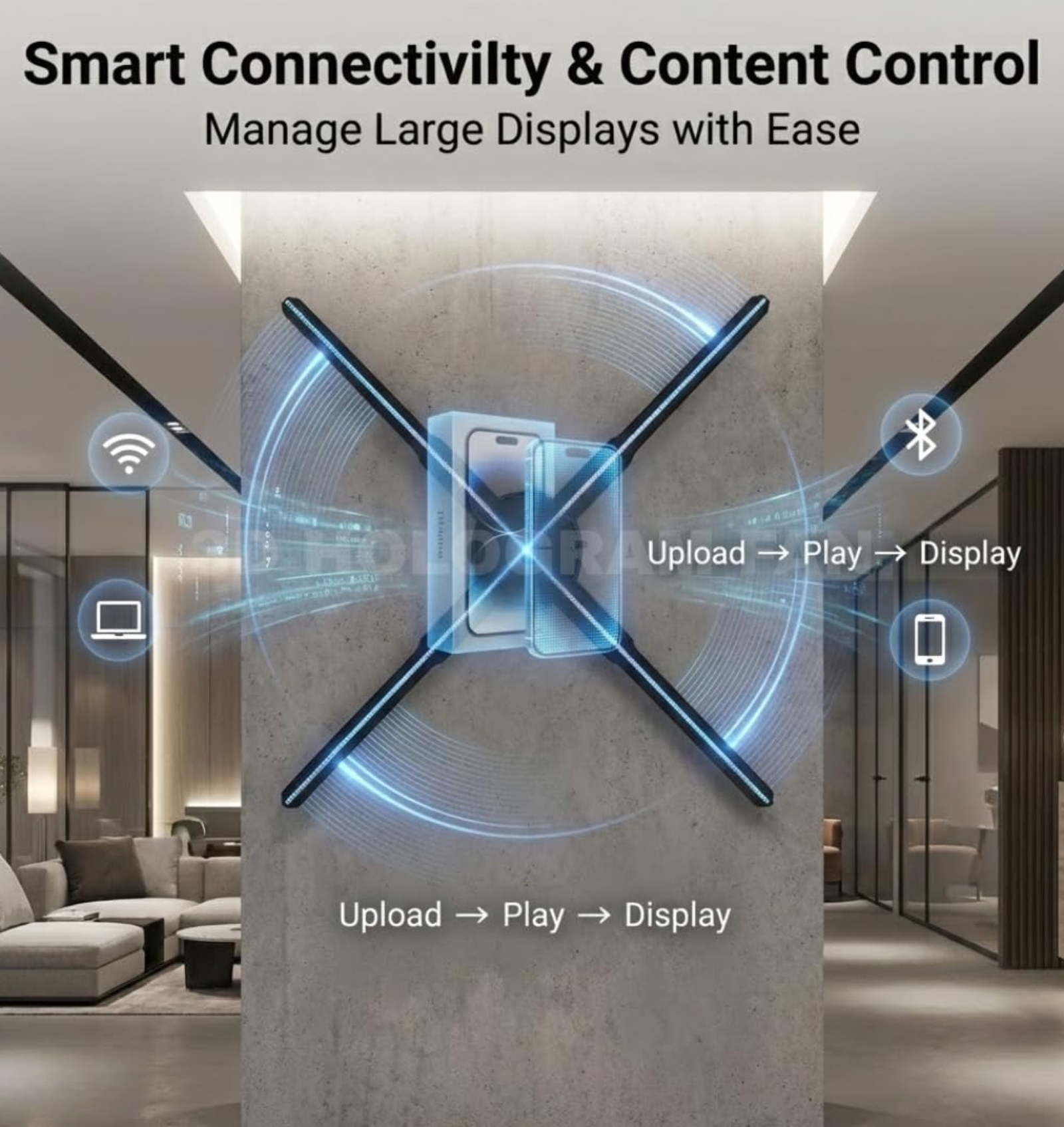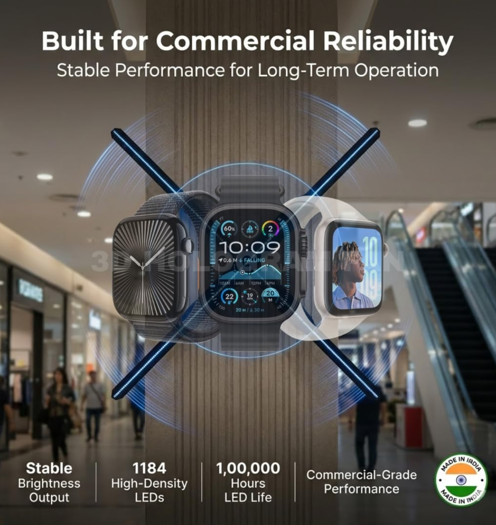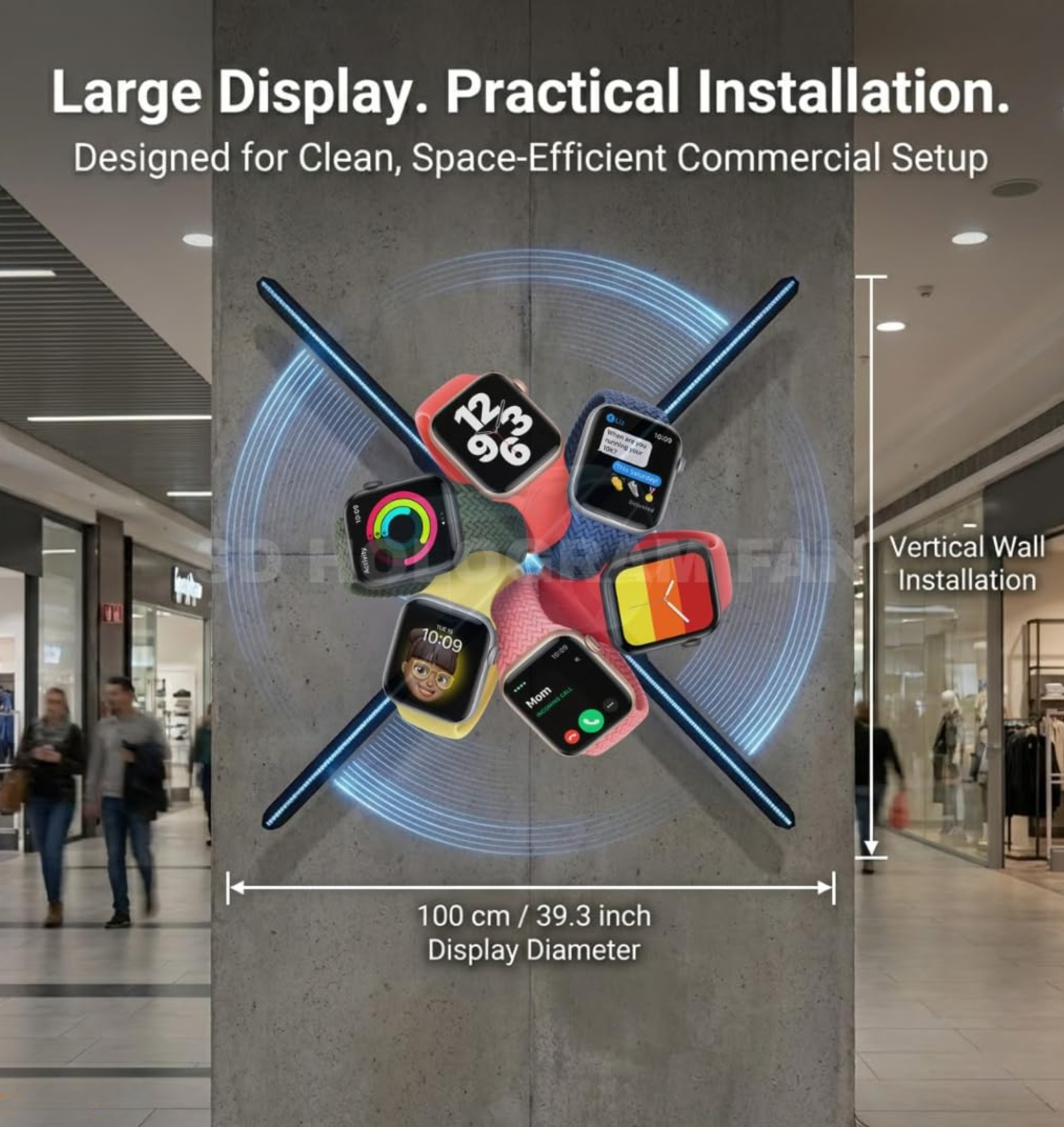 Equipped with high-density RGB LEDs and ultra-high resolution, the 100 cm hologram fan delivers bright, detailed, and immersive 3D visuals that capture attention from a long distance. This makes it ideal for shopping malls, airports, exhibitions, showrooms, corporate lobbies, product launches, and large-scale retail promotions.