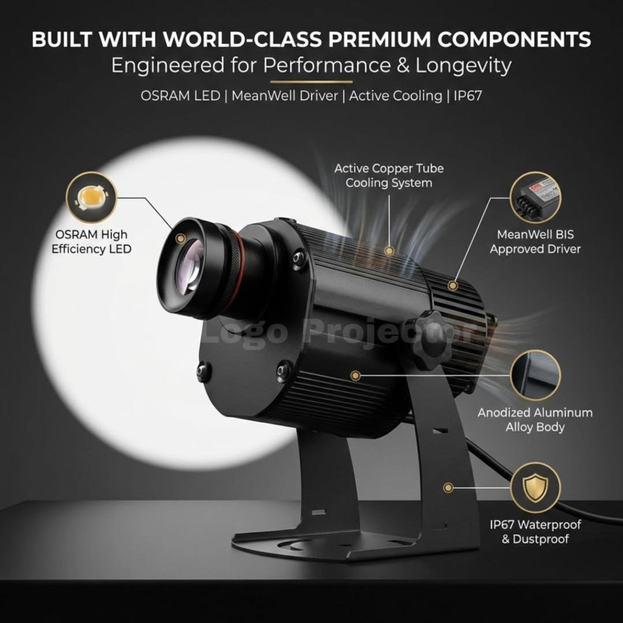 ✔ Sharp HD logo projection using GOBO lens