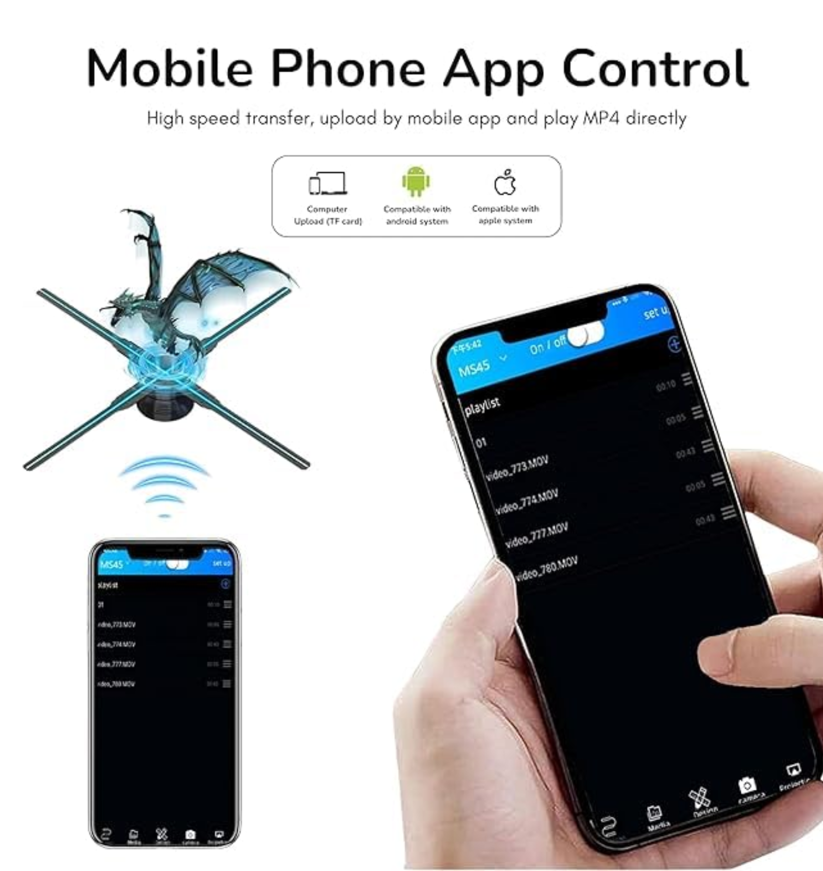 The device supports video, image, and 3D animation playback, and content can be uploaded easily through WiFi connectivity, mobile application control, USB transfer, or TF card storage, allowing quick and flexible content management.