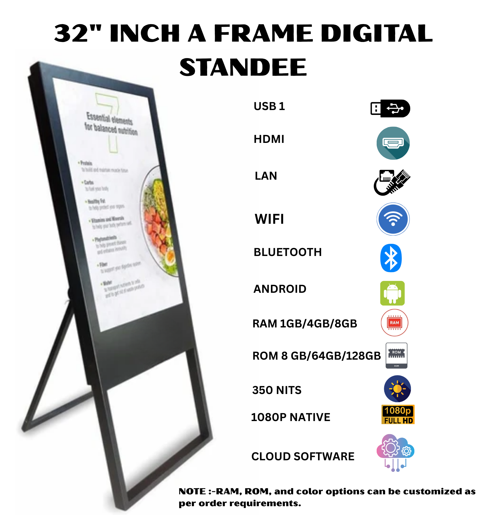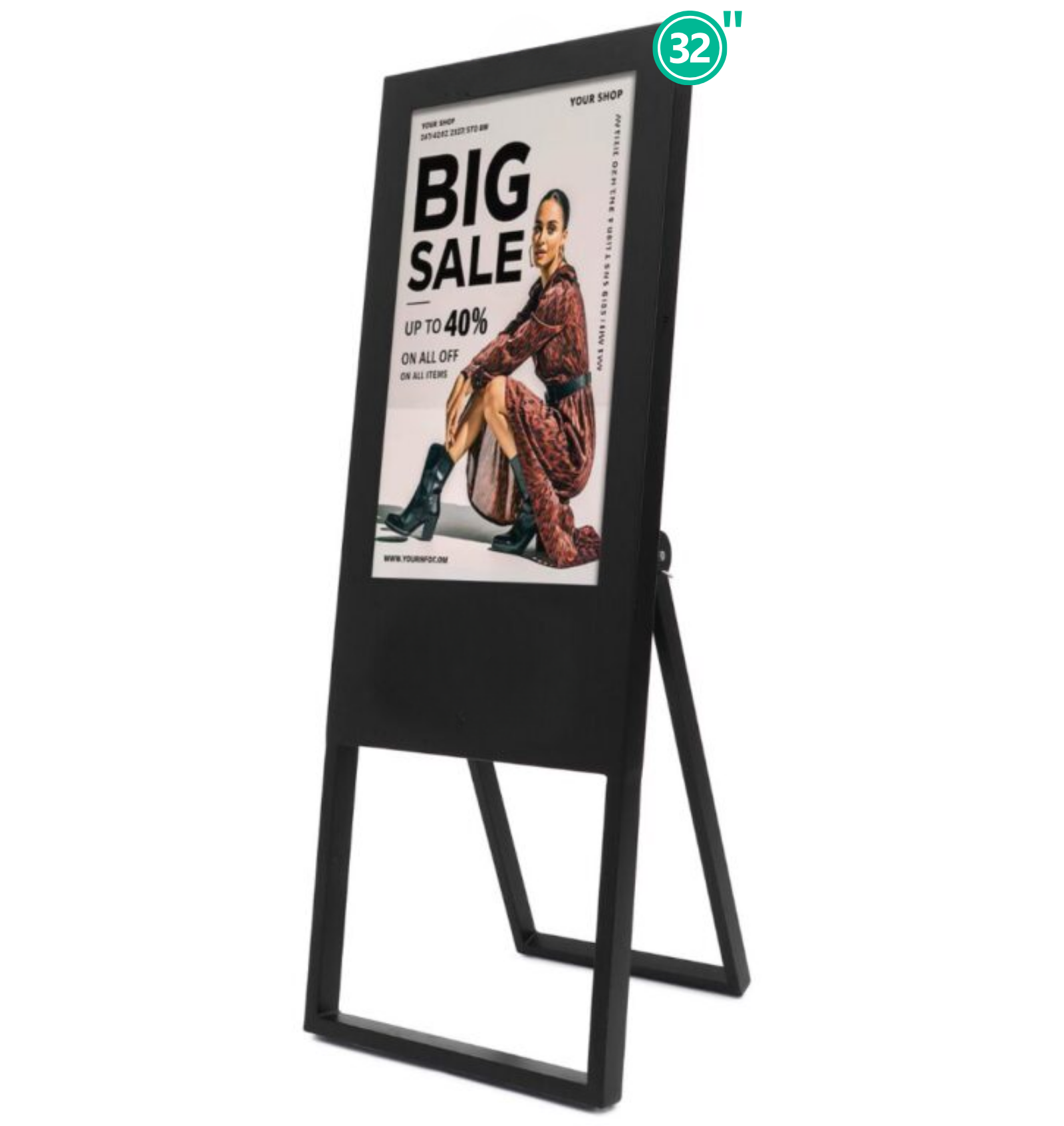The 32″ A-Frame Digital Standee is a powerful digital signage solution designed for retail stores, showrooms, malls, restaurants, exhibitions, and corporate spaces. With cloud-based content management, high-brightness display, and built-in connectivity, it allows businesses to easily display advertisements, videos, and promotions.