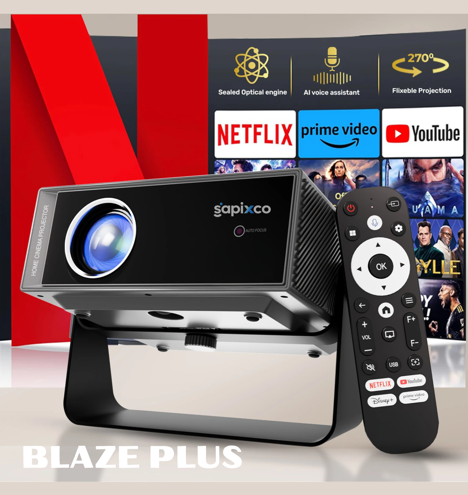 Elevate your home entertainment experience with the SAPIXCO BLAZE PLUS Smart Projector (2025 Model). Combining powerful visual performance, seamless smart streaming, and advanced connectivity, the Blaze Plus transforms any room into a cinematic experience.