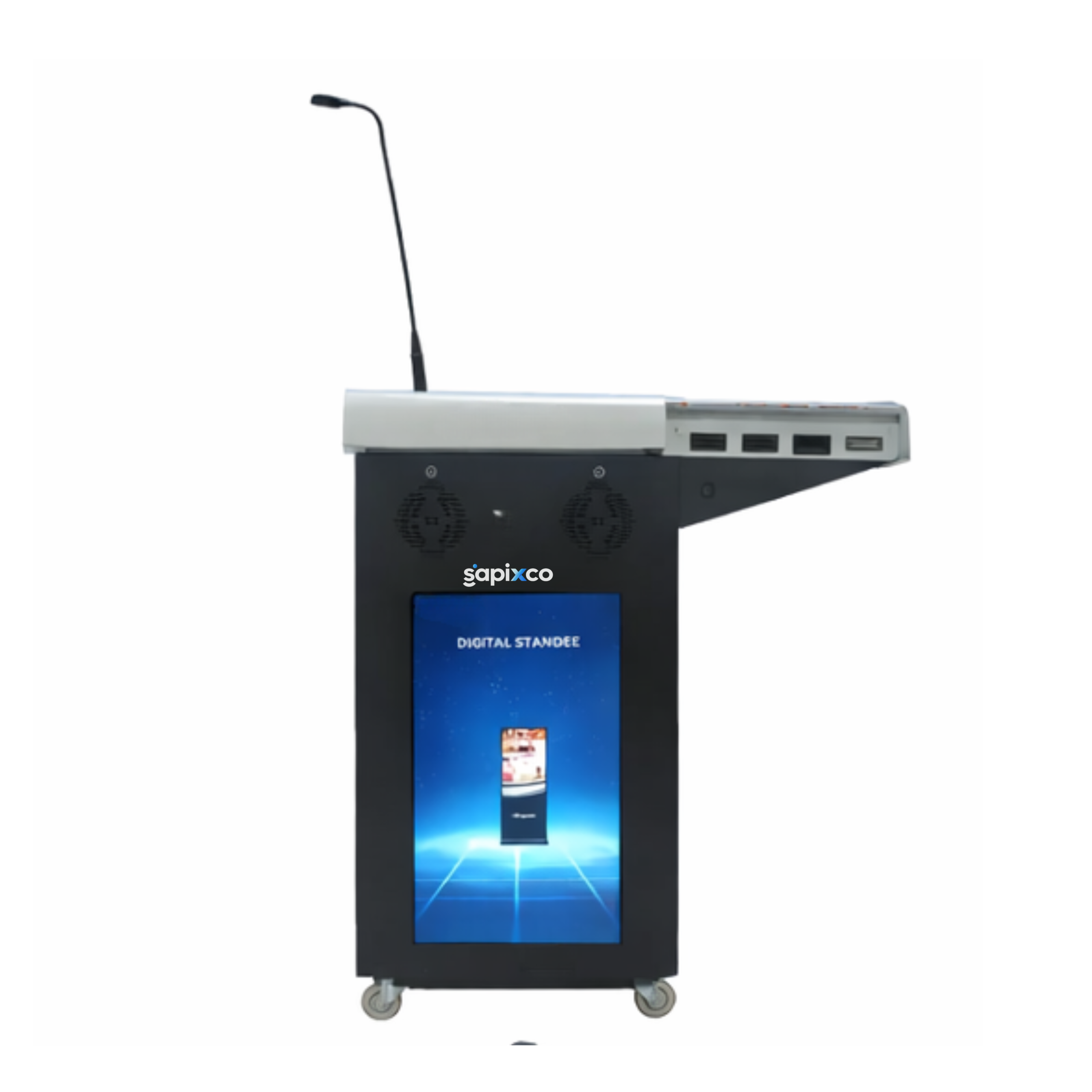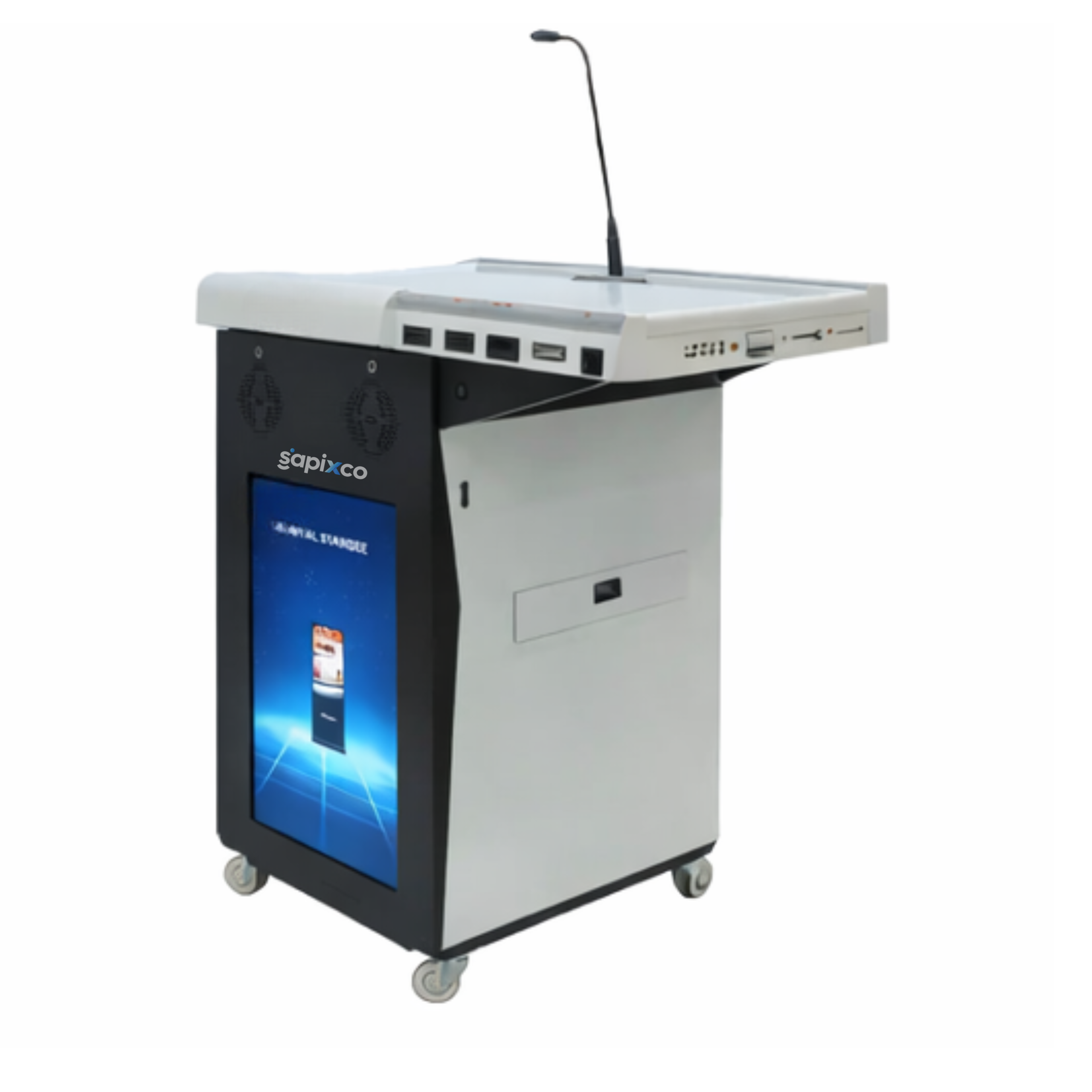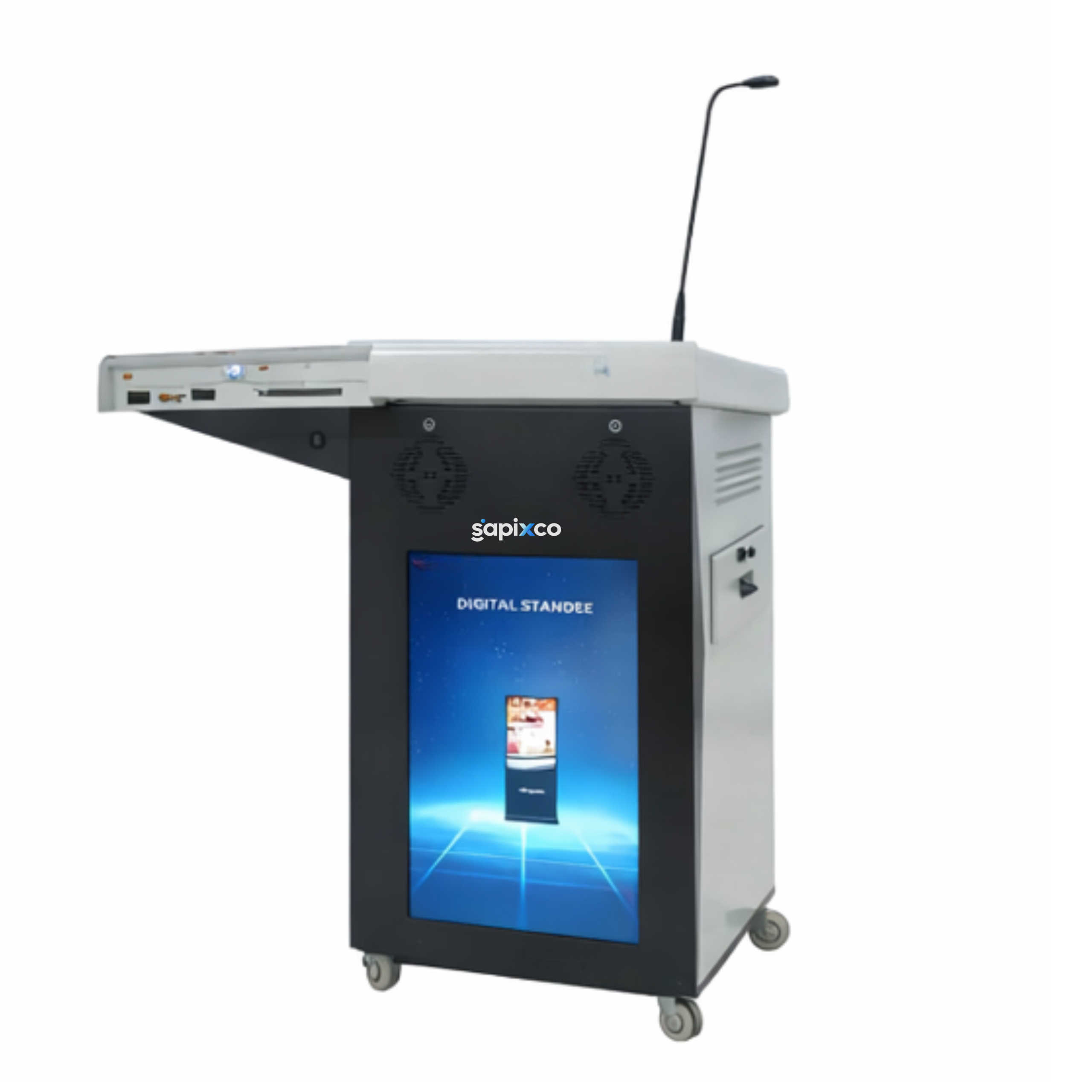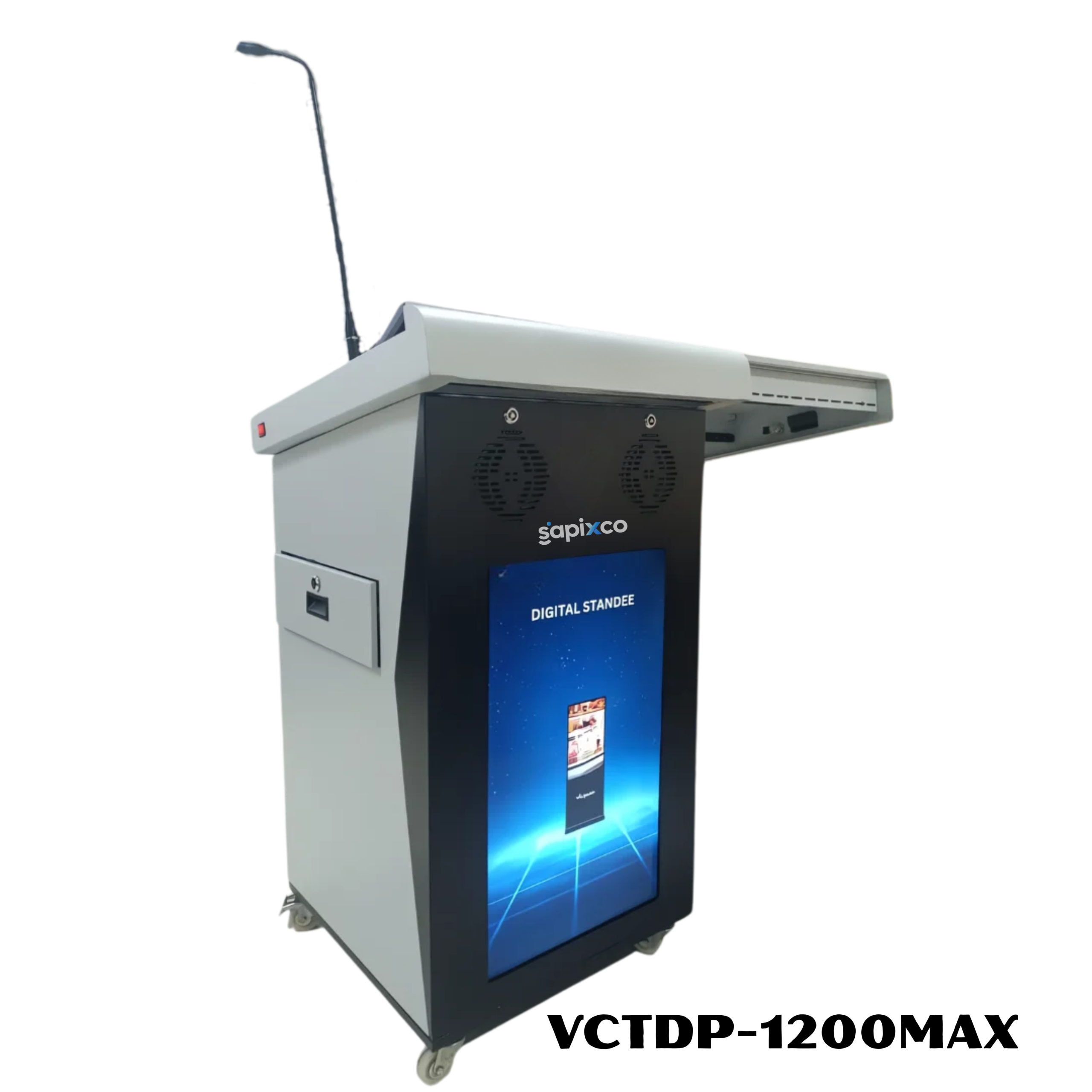 The SAPIXCO VCTDP-1200MAX Digital Smart Podium is an advanced presentation and teaching solution designed for classrooms, lecture halls, conference rooms, and training centers. It integrates audio control, microphone system, and multimedia connectivity in a compact and durable podium structure.