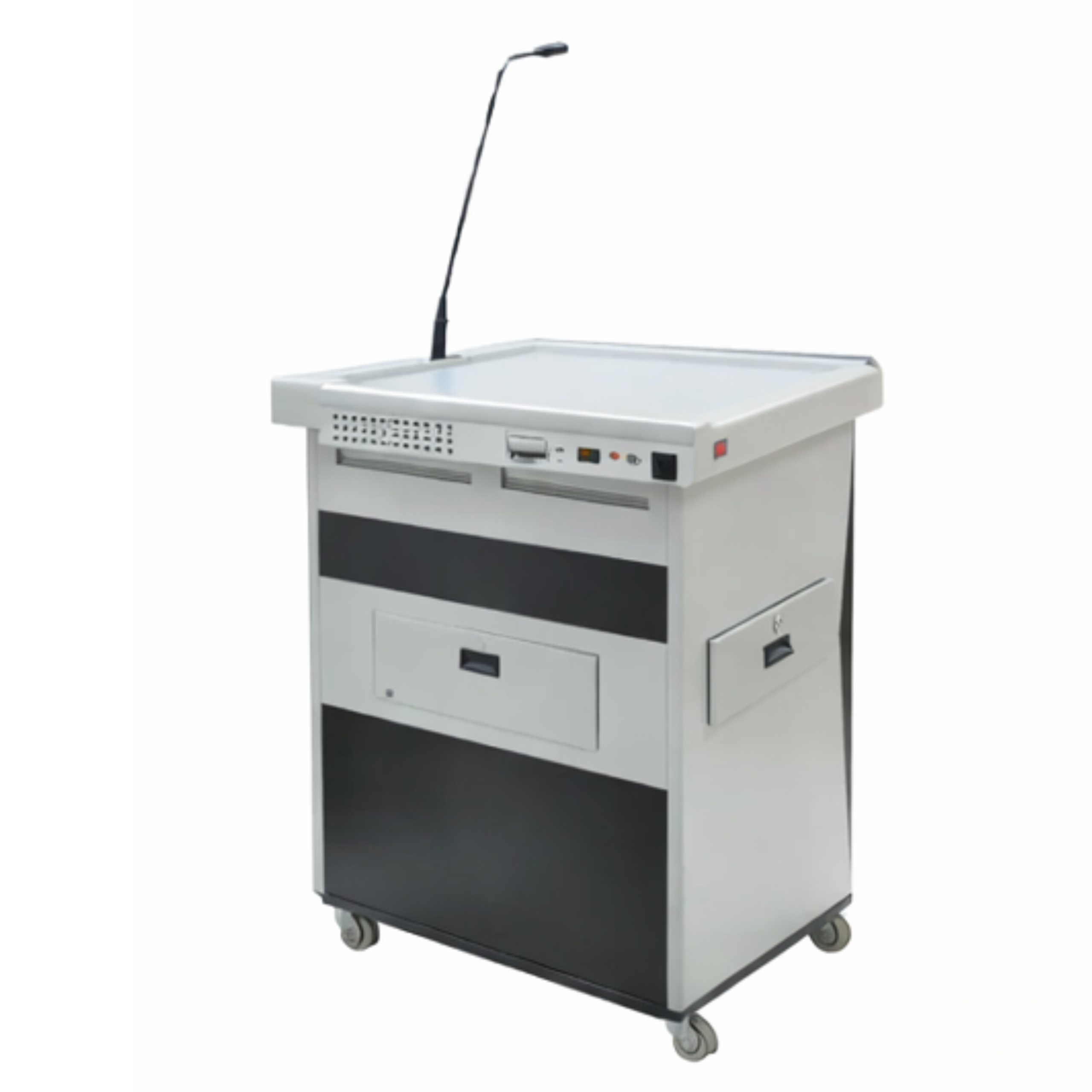 The podium allows presenters to manage audio, microphones, and external devices efficiently while delivering lectures or presentations.
