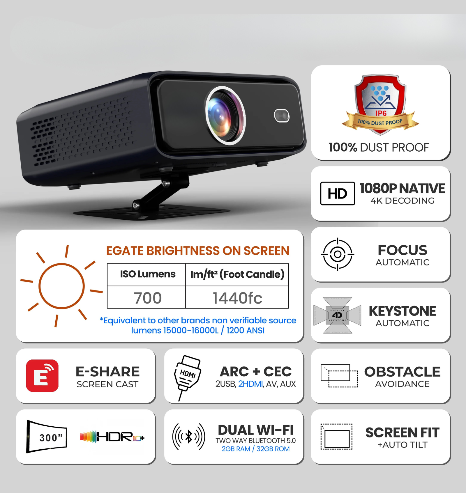 Auto Features Auto Focus, Auto Keystone, Auto Obstacle Avoidance, Auto Screen Fit