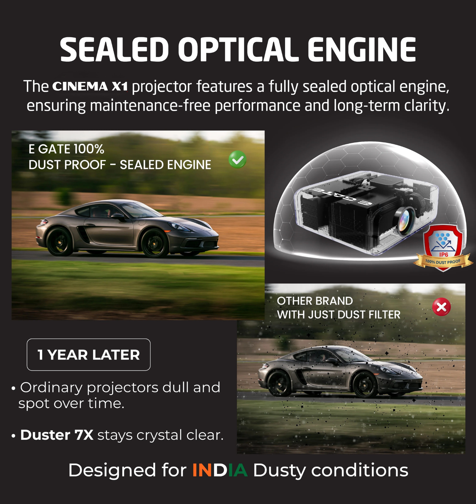 ✔ 100% Dust-Proof Sealed Optical Engine – Completely sealed optics protect internal components from dust and ensure long-lasting performance.
